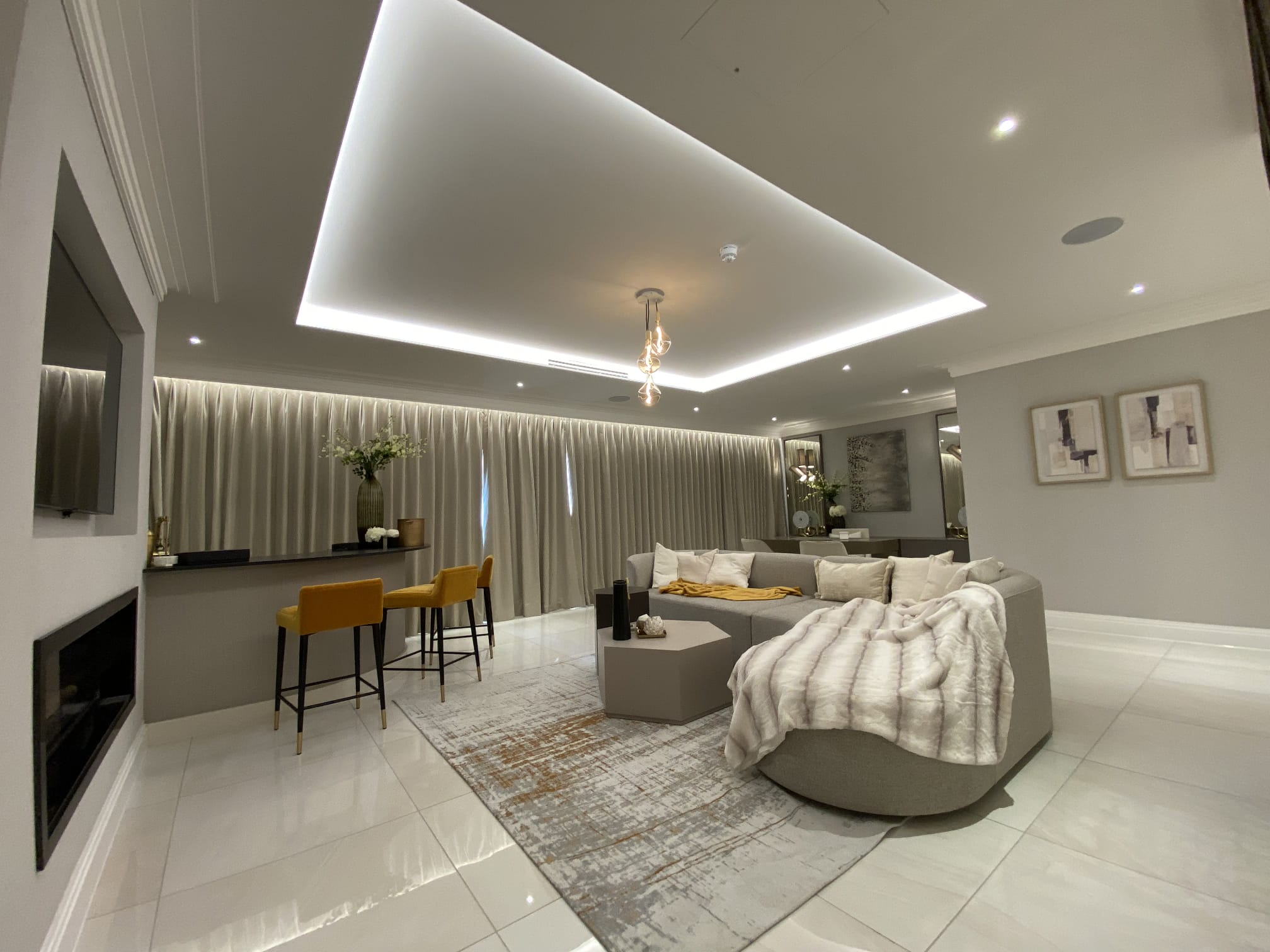 Our installation included a full Lutron lighting control system, ultra modern LED lighting and home cinema with audio system throughout. Our install included works to the entire building, including swimming pool area, gym and changing areas, offices, elevator, grand entrance with floor to ceiling chandelier and all bathrooms, kitchens and exterior lighting to the landscaping gardens.